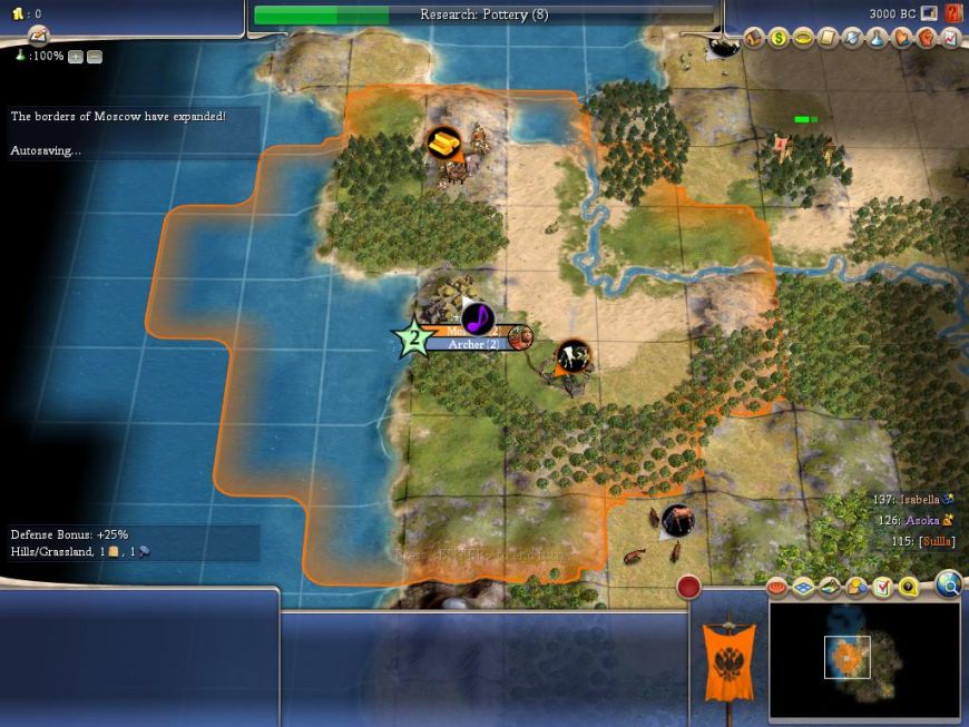 After building the worker, I spent a couple turns on a barracks while waiting for my Archery research to finish, then went right onto an archer. Never built a warrior in this game. That's about when I snapped the above picture (3000BC). The archer coincided nicely with the growth of Moscow to size 3, so I went onto settler after that. Meanwhile, my worker hooked up the cows and gold, then build cottages on the floodplains. And there you have my opening (I always try to describe the first 30 or so turns in close detail for the reader, then my notes get looser after that).