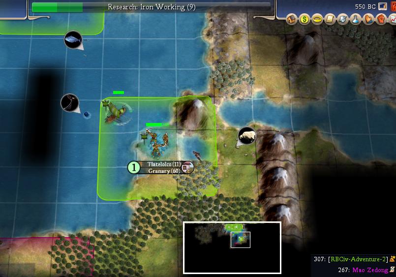 I prefer the Flying Camera to the globe view, but I couldn't figure out how to access it while playing this game. (Kylearan later told me that it was moved from Ctrl-F to Ctrl-Alt-F... yeah, that makes a LOT of sense. ) Tenochtitlan is trying to rectify my sad defensive situation by building some of my best unit, Jags. Teotihuacan is still pursuing the Colossus (it's been giving one up for the team this whole game, going Work Boat -> Galley -> Forge -> Colossus.) Tlatelolco is working on a library because it needs to win the border culture war with Nanjing, and Texcoco is still just starting out as a new fishing village. My next city will be going to the west of Texcoco, in order to pick up the copper you can see there (and wow is that bad land otherwise).