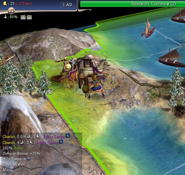 Yikes! See, this is why I've talked so much about needing to get defenses up and running. There is no such thing as a Farmer's Gambit in Civ4; if you can't defend what you have, the AI civs WILL come and take it away from you. The whole time I'm playing, a clock in the back of my mind has been ticking "better build some defense... time's running out..." Well, the alarm just sounded! Let's see what Caesar's bringing: