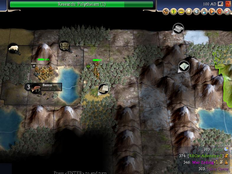 Take a look too at the religious icons in that picture above. Mao has adopted Buddhism! The religion spread on its own to one of his cities in 75AD and he converted the following turn. I still plan to send a missionary down there to convert his capital and solidify a friendly relationship. I've got to get Mao on my side or Tlatelolco is toast! (If turned to the Dark Side... a powerful ally he could become.)