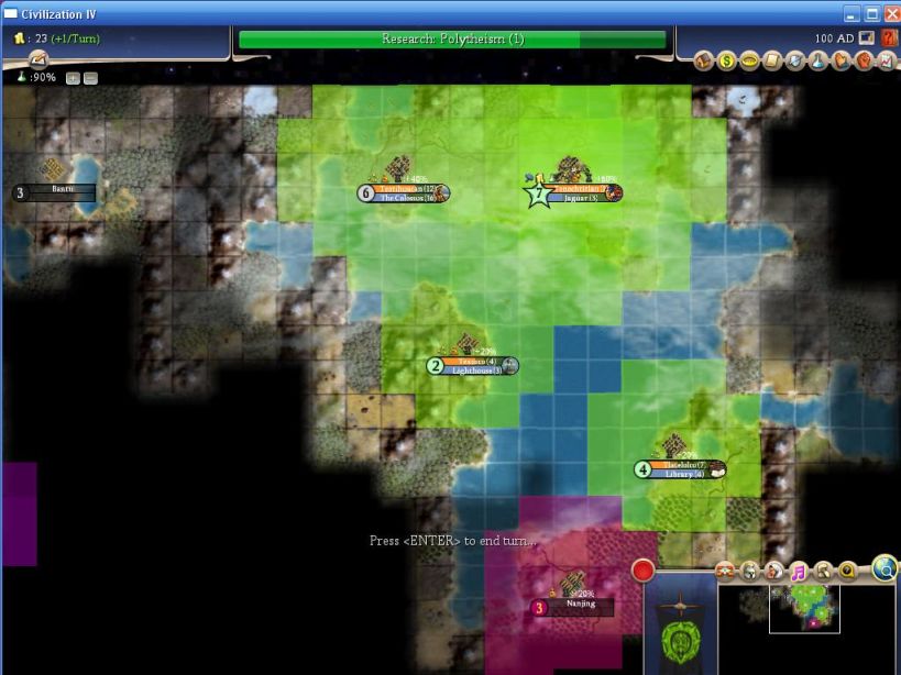 I had played a rather strong opening, grabbing a religion and two early wonders, but now I needed to build some actual defenses to protect what I had while also expanding into the few good lands to the south as rapidly as possible. In other words, I had to pursue two conflicting goals at the same time (Expand! Protect what you have!) This is going to be fun.