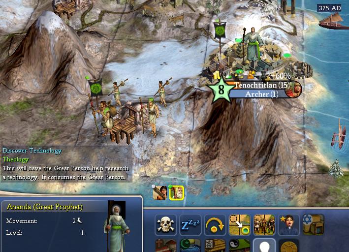The capital finished its settler in 625BC, and he hopped onto the galley I already had waiting along with an archer and set sail for the south. More importantly, Tenonchtitlan generated its first Great Person (a Prophet, obviously) which I used to build the Buddhist shrine.