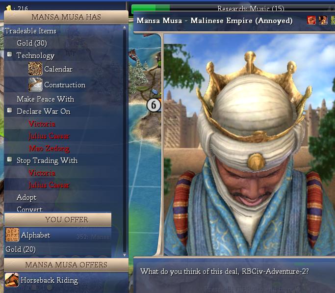That's the great thing about the Stonehenge/Oracle combo: guaranteed to get some early Great Prophets. Of course, if you don't want Prophets, then you've got a problem on your hands! I was more than happy to take Theology as the free tech, although someone else had already founded Christianity. On the same turn, I met Mansa Musa and swung a tech deal with him too: