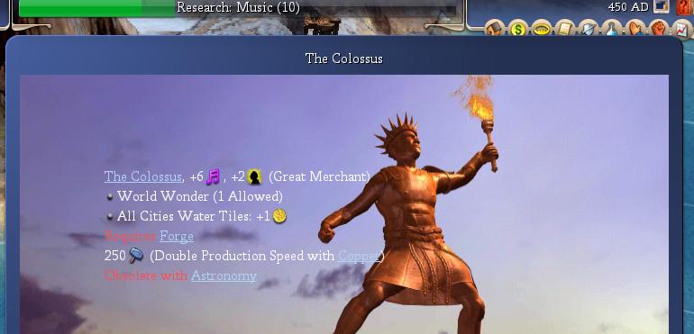I finish a library in Tenochtitlan in 580AD, begin working on the Great Library (13 turns). Since no one else appears to have Literature, and I have marble, I felt good about my chances for the wonder. Yet another trading opportunity for Metal Casting appeared the same turn, and I traded the tech to Mansa Musa for Code of Laws. Wow, have I ever gotten great value out of that or what? For whatever reason the AI civs didn't pursue the tech in the early going, and thus my Oracle build landed me the Colossus and three more techs (Construction, Monarchy, Code of Laws) in trades! I couldn't have written the script any better than that myself.