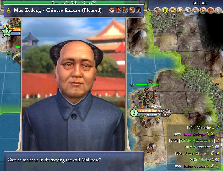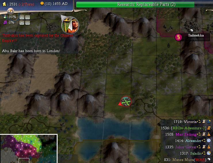 I receive word in 1350 that Mao has already captured the Malinese city of Awdaghost. Impressive work, big guy! Just to help out China further, I trade Mao Divine Right for Engineering and 100g - although that probably didn't have too much of an effect on the war, to be honest. (Again, the "useless" tech of Divine Right got me 2 others in tech trades. Any monopoly tech is worth grabbing if the AI civs don't have it!)