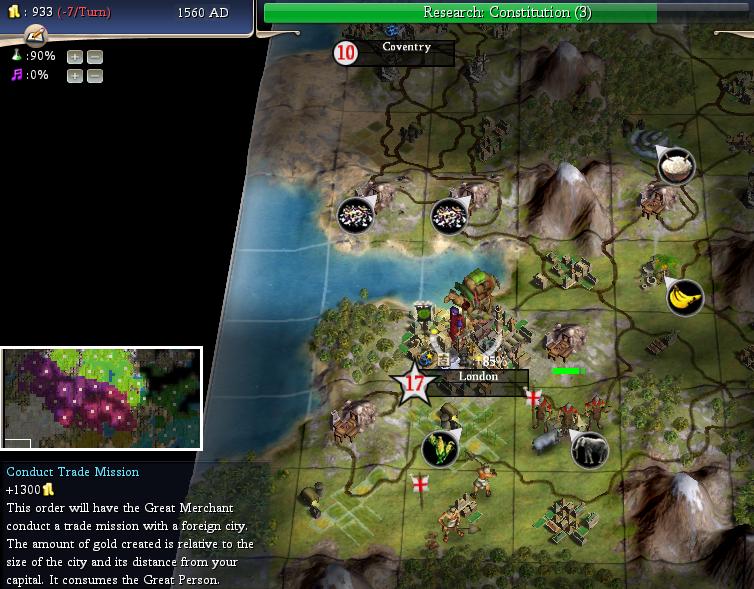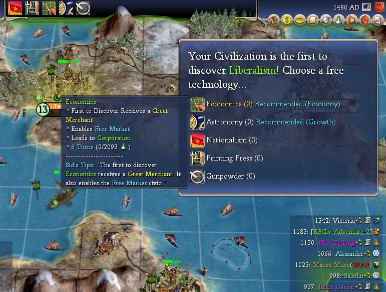 It was a no brainer to take Economics and the free Great Merchant, who I sent towards Victoria for a trade mission. Research headed next into Gunpowder just to be safe, before going for the top of the tech tree and heading towards Democracy.
