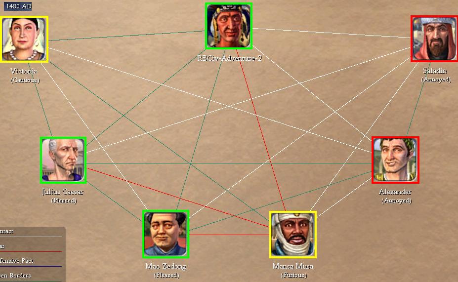 There are three blocs that have formed to this point in time in the game. First of all, Mao and Caesar and my Azteskimos form one group (which I have placed in the green boxes), based on our shared Buddhist faith and trade relations. Secondly, Alex and Saladin form another bloc (in the red boxes) over in the east, based around Judaism. The final group (in yellow) is the less-certain alliance of Victoria and Mansa Musa. They each have different religions (Hinduism for Vicky, Daoism for Mansa Musa) but have largely been good friends to this point throughout the game. My relations have slowly been warming up with Victoria, however, and she gets along with Caesar, so there perhaps is hope for warmer relations with the English down the road. The two eastern civs are strictly isolationist and do not get along with anyone else.