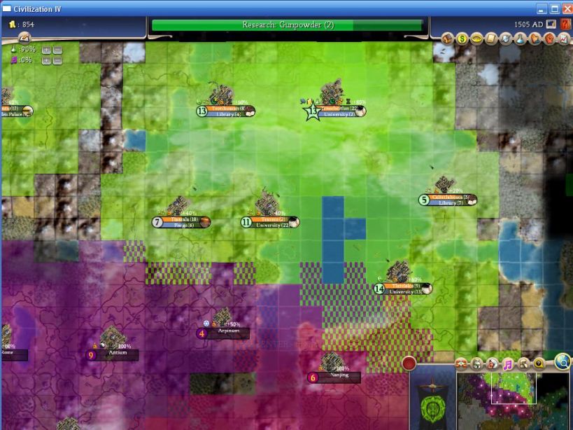 I'm in the midst of a round of library/university construction at the moment, having recently acquired Education. Bantu is working on the Forbidden Palace, Etruscan is out of sight to the south of Tlatelolco. Researching at a break-even rate at 90% science and really tearing it up technologically (look how fast the bar is moving on Gunpowder!) Economically I can support more cities, but there's no room to put them. I will squeeze in another city between Bantu and Tlaxcala, and another to the east of Tlatelolco, but that's all I will get. Saladin will claim everything to the east of Calix, which I could have had if I pushed there faster. I expect some of our other players will do better there and grab some more land in the east.