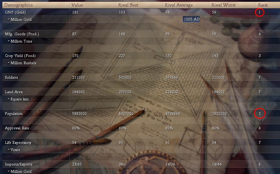 And the demographics from the same date. The big stats are the one I have circled; despite the tundra start, I am actually #2 in population! That just goes to show how the AI doesn't do nearly as good of a job of growing its cities as a human can. Most important, however, is my complete dominance of the GDP stat. My commerce is amazing! #1 by an overwhelming margin - the next closest civ barely has HALF of my commerce! In everything else I am doing poorly; last in land (although that's not entirely accurate because water tiles don't get counted in that) and last in soldiers. In other words, still running a huge bluff here; TONS of commerce, but my territory is only lightly defended. With cities scattered all over the lake, it would be a logistical nightmare moving soldiers around anyway. I hate to leave myself vulnerable like this, but I HAVE TO push infrastructure now, or I won't be able to keep up in the tech race later. If I build enough units to be safe, I will lose my tech lead. Therefore, I have to keep hoping that the other civs stay in wars, slow each other down, and largely leave me alone. Aside from the early war with Caesar, so far so good.