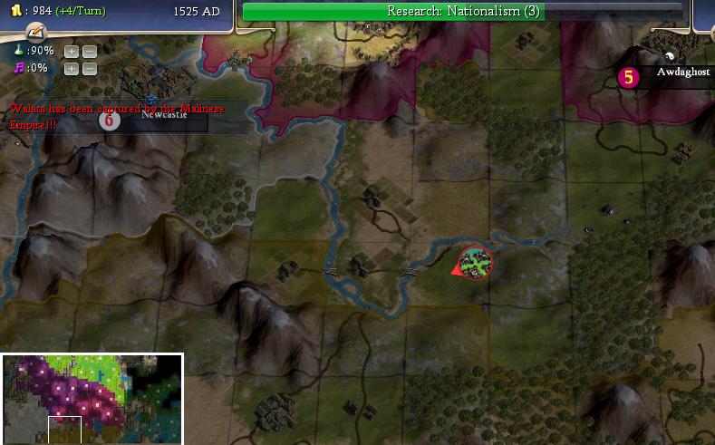 Nationalism was a relatively recent tech, but everyone else already had Philosophy, so this was another steal for me. I also decided to break my Liberalism monopoly at this point and sold it around for almost 2000g, which helped paid for the upgrades. Ah, the advantages of being AHEAD in the tech race instead of being behind. What a contrast from having to play catchup the whole game in Epic One versus a runaway Washington.