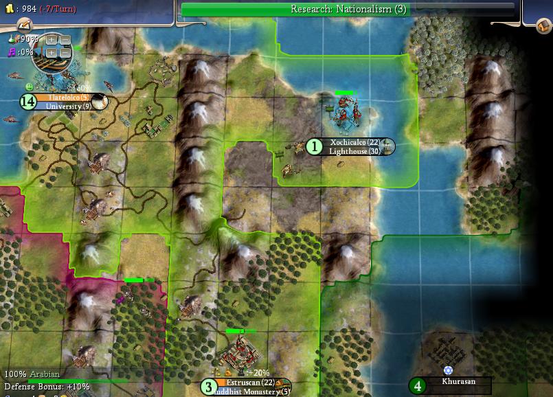 Tlacopan is a relatively recent addition, added in order to plug space in the west. The land there was slim pickings, but just good enough to support a city. The only spot I wanted that I didn't get was the Arabian city you see in the top right corner; there was good land there, and I just missed out on it. A lot of these builds are about to finish next turn and observatories get started; there are also some longer-term builds going on (Statue in Tenochtitlan, Oxford in Tlatelolco). Overall, looking good.