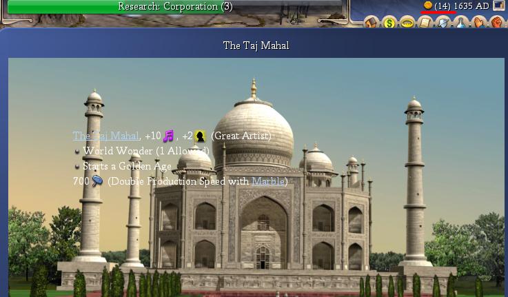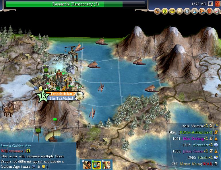 I discover Democracy in 1630, and conveniently Tenochtitlan finishes Taj Mahal the next turn: