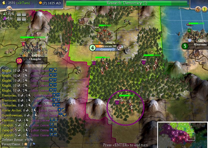 One thing that's generally a given in Civ4 is that once all the land on the map has been filled, tension increases between the civs. It doesn't always lead to war, as many of the AI civs have peaceful personalities, but once the more aggressive civs run out of land, they become much more likely to declare war on someone. I was the weakest civ militarily, and thus the most likely to get attacked - except that I had already made friends with Mao and Caesar. Therefore, when Mao decided to rough someone up, it turned out that I was not the target: