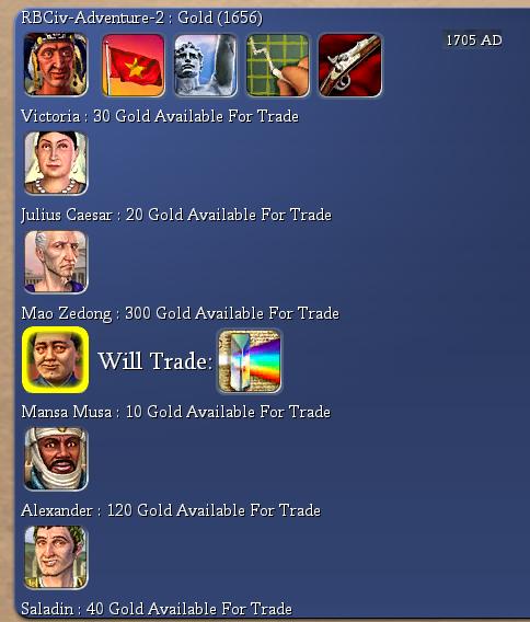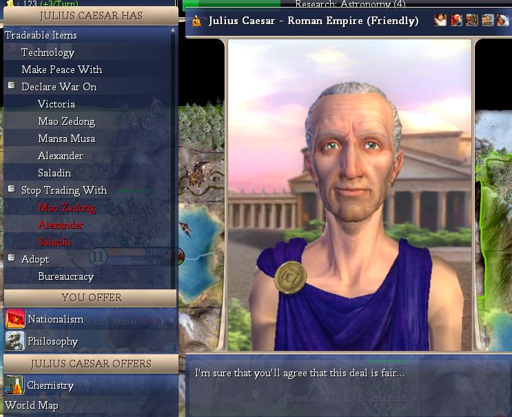 Finish Rifling in 1685, finally start Astronomy. It will obsolete my Colossus of course, but I need to get started on observatories before any more time passes. Many, many units upgraded to rifles, giving me some real defense capable of stopping an invasion for the first time in ages. Caesar somehow gets his hands on Chemistry, allowing me to make this trade:
