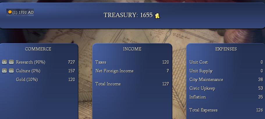 Mao is the only one who has a tech that I lack (Scientific Method) while I am up about 3-4 or more techs on everyone else. No one else has Rifling, which is a big relief. And have I mentioned how much I love the fact that the F4 screen now displays the gold that each civ has as well? What a fantastic addition in the 1.52 patch! Whoever coded that, thanks a lot, it's a huge help while playing!