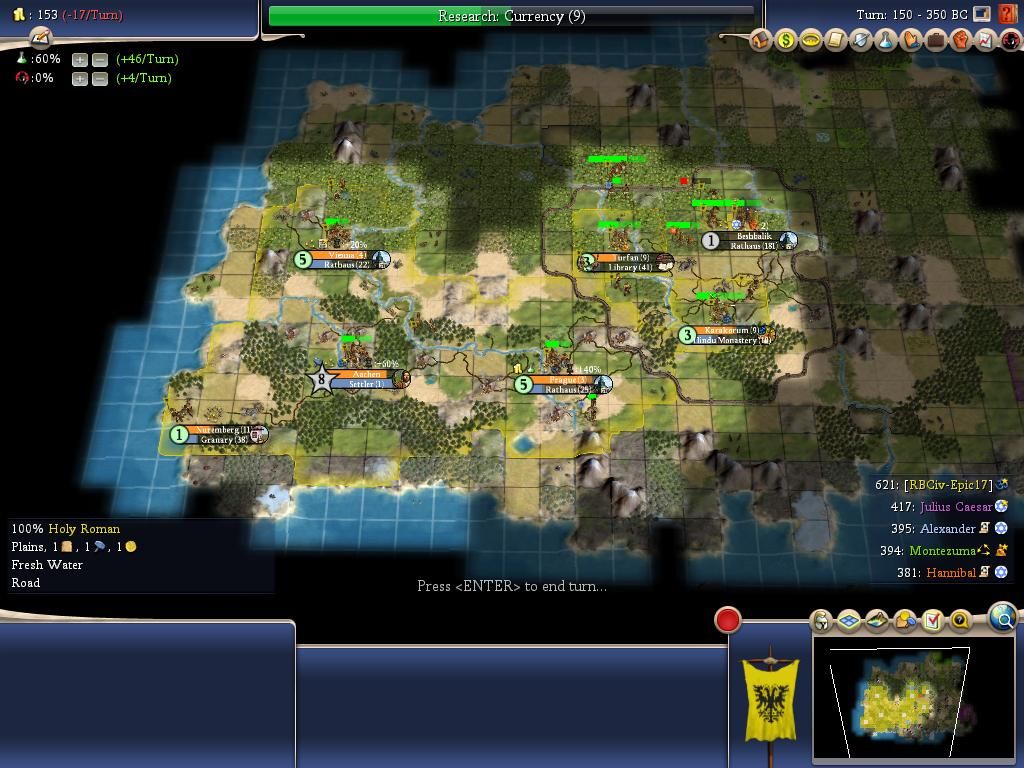 The good news is that even though it's taken me longer than expected to remove Khan, there's still a ton of land up for grabs. The whole north and that narrow strip of land to the south remains unsettled, plus there's even room to put additional cities to the east before the Romans snap up that ground. Aachen is almost done another settler, and here - on Epic speed, with a production-heavy capital - the Imperialistic trait actually did me a fair amount of good. With whipped Rathauses, I was confident that I could settle a very large number of cities without going broke. The key goal now was to city-spam, Civ3 style, before all the land was taken.