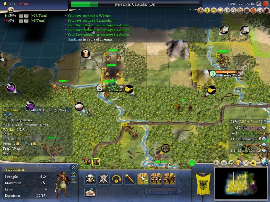 Up north, you can see the barb cities of Cimmerian and (in the corner) Angle. There were actually two more barb cities, one in the far southeast, and another in the extreme northwest. For once, I was happy to see the barbs popping up, as they delayed the AIs from settling in those regions for many years on end. Even better, I had a few City Raider III swords left over from the Mongolian campaign, which meant...