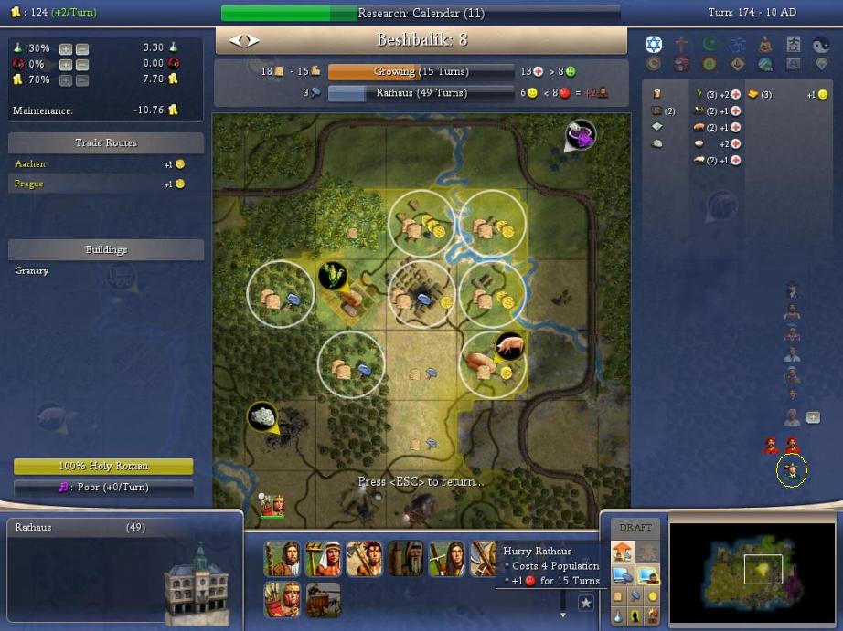 We've long known that whipping courthouses is pretty much the single most effective thing that you can do in this game to recover from economic peril (well, that and building cottages, of course!) Rathuses are like courthouses on steroids. With pigs and corn, I could easily grow Beshbalik into unhappiness, and then whip four unlucky souls to pop out one of my unique buildings. That dropped the costs by 75%, down to less than three gold/turn. So long as a rathaus was the second build in each city (after a granary), I could continue to expand almost indefinitely.