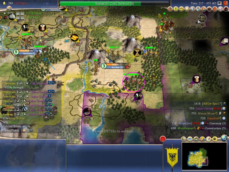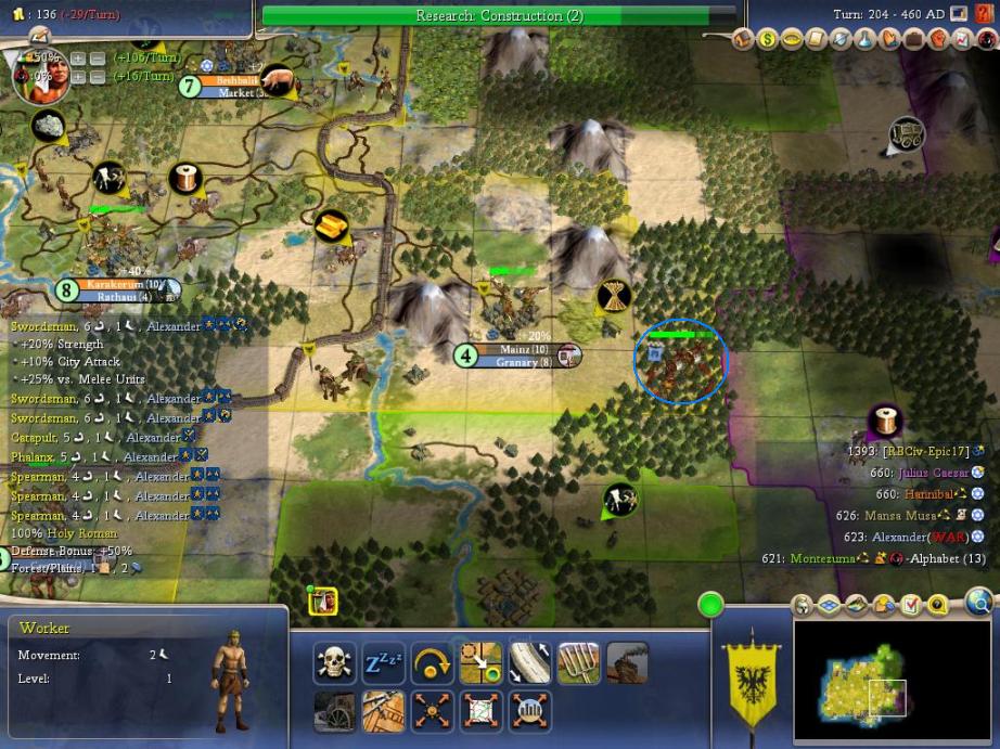 I of course whip walls in Mainz immediately, an easy thing to do since I had stone on hand. (There's also marble near the player's start. Some of the peaceful games might have a lot of fun with wonder-building, especially those who take Industrious civs! Philosophical + wonder resources can be a real riot too.) Then I whipped an (unpromoted) archer on the next turn, using the shield overflow. To my surprise, Alex's stack bypassed Mainz and contined moving deeper into my territory. Huh? That was almost Civ3-esque. I wonder if whipping the walls had something to do with it (?) In any case, Mainz was still breathing, for the moment, while Karakorum was now shaping up to the battlefield.