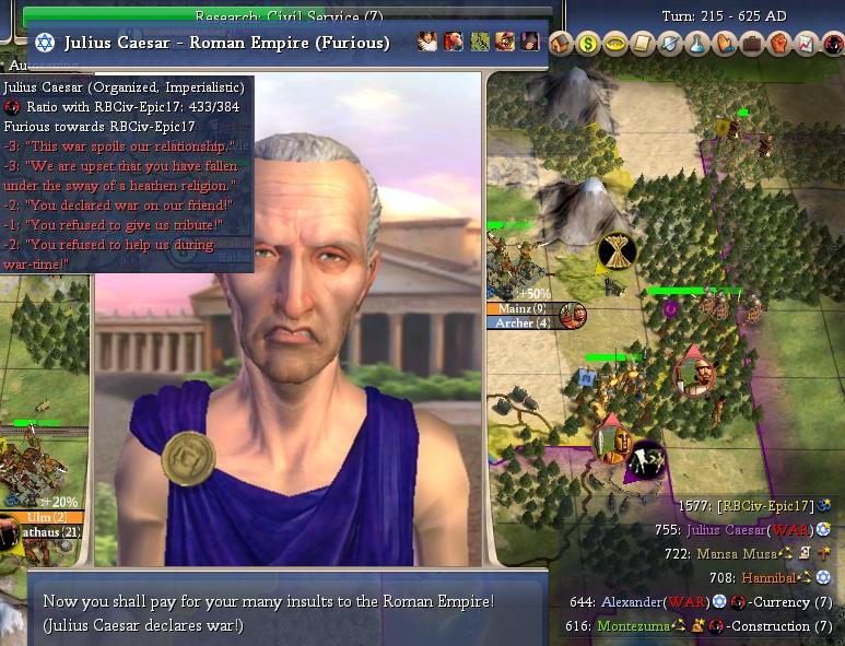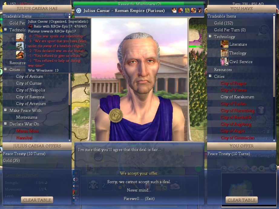 So Mainz returned to my control yet again. And now, with my civ completely and totally gassed, with a stack of four units right outside the city, Caesar was willing to sign peace!