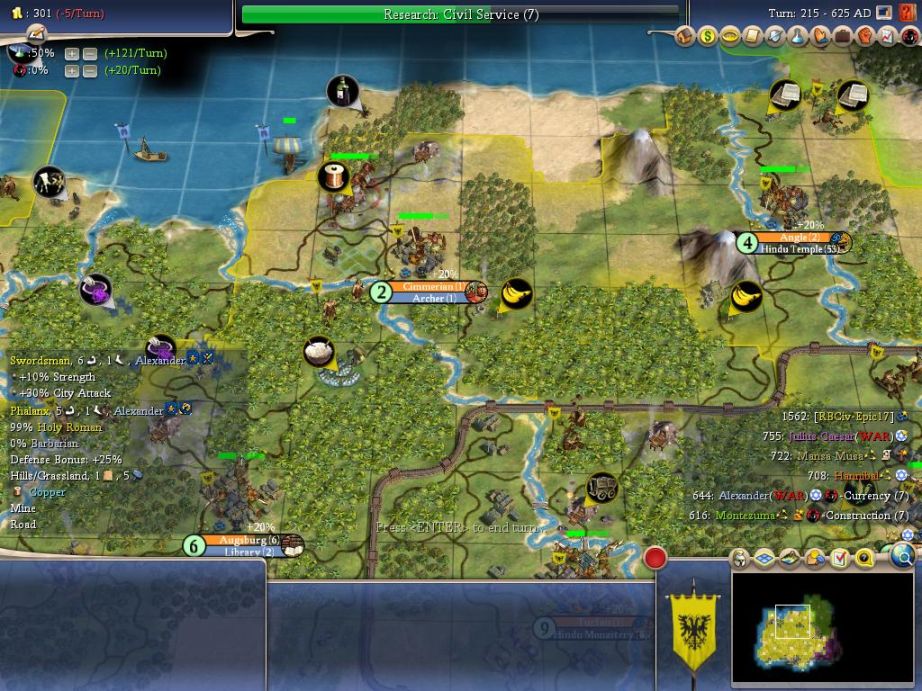 Notice that my science rate was all the way down at 30%, although the beaker count remained decent at about 40/turn. I suppose that's what you get for having 10 widely spaced cities before the AD years! For a normal civ, that would pretty much put an end to expansion for a while, until the new cities could get their infrastructure up and running. Now here's where my choice of the Holy Roman Empire began to shine: Rathauses to the rescue!
