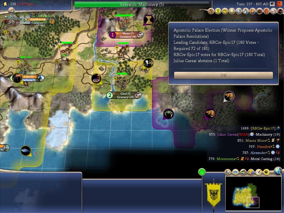 There's the first vote taking place. Caesar got one vote because he captured Mainz, and that would be it. For whatever reason, I never got the opportunity to propose any resolutions; was that because I was the one civ in the world with Hinduism as my state religion (?) The Apostolic Palace is another part of the gameplay that I just don't know much about. This is only my third full game on Beyond the Sword, hard as that may be to believe!