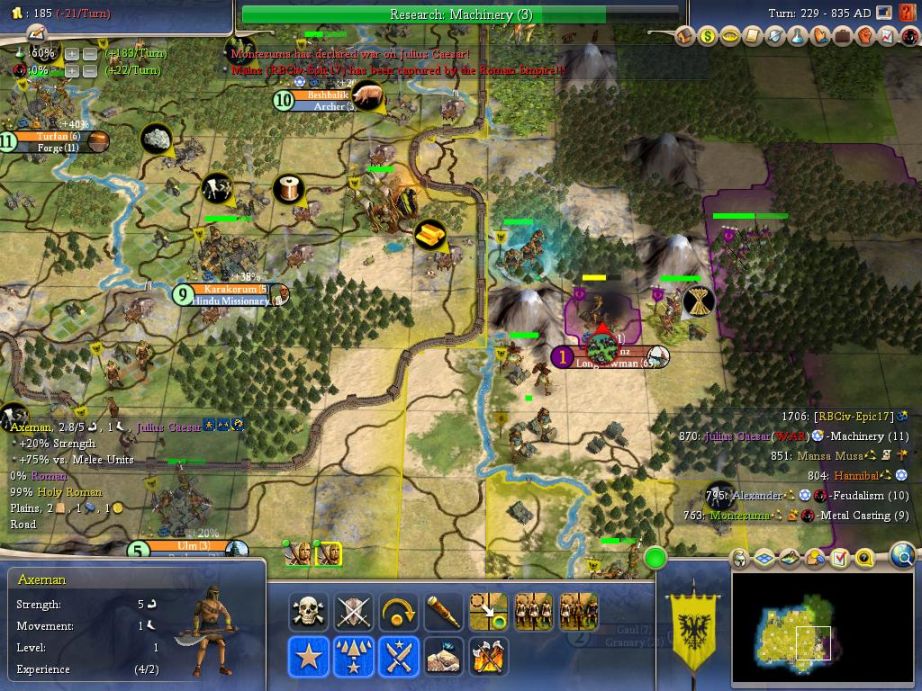 Monty actually jumped into the war here as my ally, of his own accord. (Imagine that!) More importantly though, the Romans had only a single unit left in Mainz, so on the 835AD turn (T229) I recaptured the city back to my side, taking out the axe you see above. On the following interturn, Rome again grabbed the city back using the Praetorian you see on the wheat tile. However, there were only TWO units left to defend Mainz on the 850AD turn: an axe and a redlined Praetorian. First, I took out the axe using my Medic III (Great General) chariot, a unit that was never supposed to see combat at all. That left the one remaining unit in the area, a simple axe, to take out the redlined Prat: