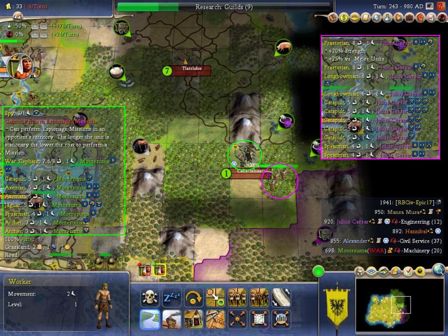 By 980AD, I felt that I had enough maces and cats/trebs to go on the offensive, so I declared war on Montezuma (the weakest AI civ in the area). It didn't hurt either that Monty was still at war with the Romans. Check out this battle that one of my spies was watching: