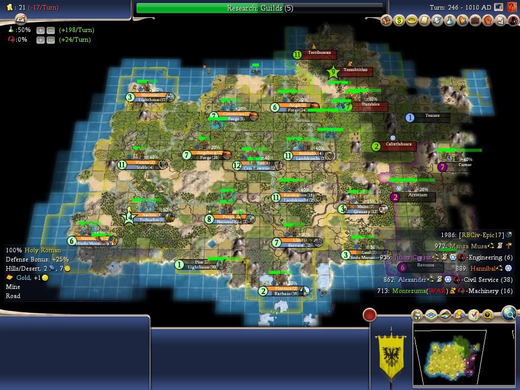 I often advocate placing the Heroic Epic in a city other than the capital, and using that location to do nothing but crank units throughout the game. Well here I went with the more conventional route, stacking the Bureaucracy bonus along with the Heroic Epic for rapid unit training. Note however that Aachen only has a single cottage; even with Bureaucracy, this isn't my top commerce city. I intended this to be a production city from the start, and it's certainly living up to that goal.