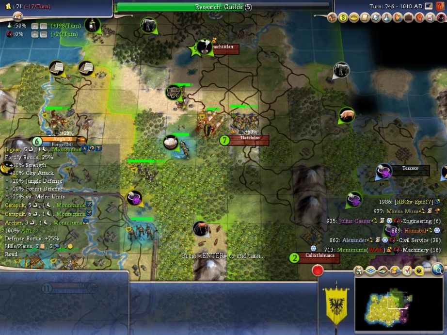 I took two turns to reposition my forces, then jumped all over Caesar, the next target in line. I managed to catch some of his units returning from the Aztec front, where they were easy pickings. The former Aztec city of Calix was right on the border, and easily steamrolled by the force in the screenshot above. From there I drove my knights deep into Roman territory, pillaging at will and clearing a path for the trailing siege engines.