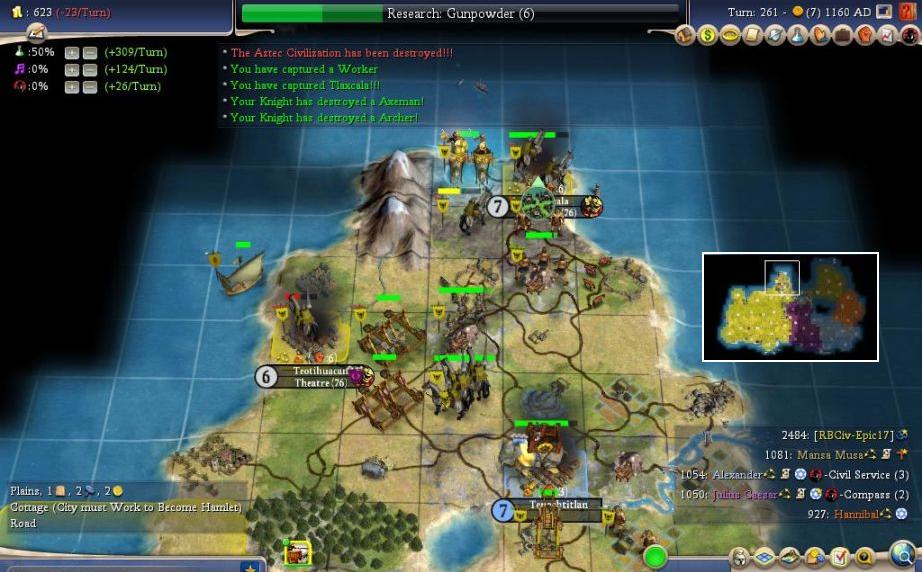 That gives you a good view of Alex's horse-heavy stack, as well as the remnants of the Aztec civ. A single turn later, it was over for Monty: