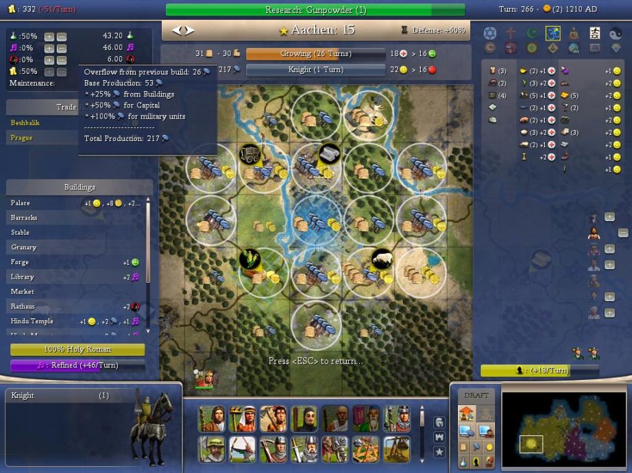 Each turn I was getting slightly more overrun than the next, actually increasing the shield output of the city. That meant that I got 10 knights just from the Golden Age, and ended up with enough overflow to continue with a knight per turn for another four or five turns after it finished. With each knight coming out at 11XP - that made a BIG difference! The GA helped many other cities produce units as well, not to mention assisting my sagging finances as I continued to absorb more cities. It was possibly the most useful Golden Age I've ever had in Civ4!