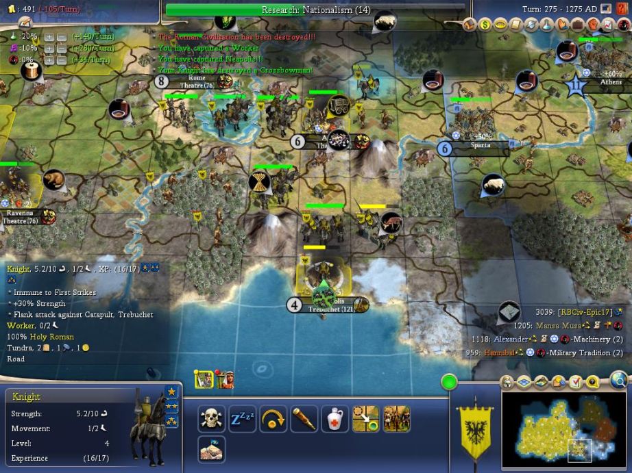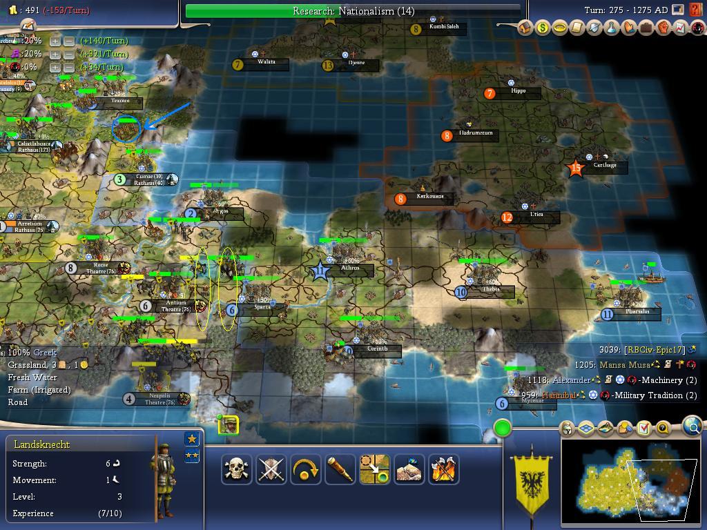 This essentially meant that I had to declare war on Alex right here and now, in 1275AD! Anything else would delay my units and push back the front. So even though it was still the same turn that I finished off Caesar, I declared war on Greece and proceeded to grab Sparta.