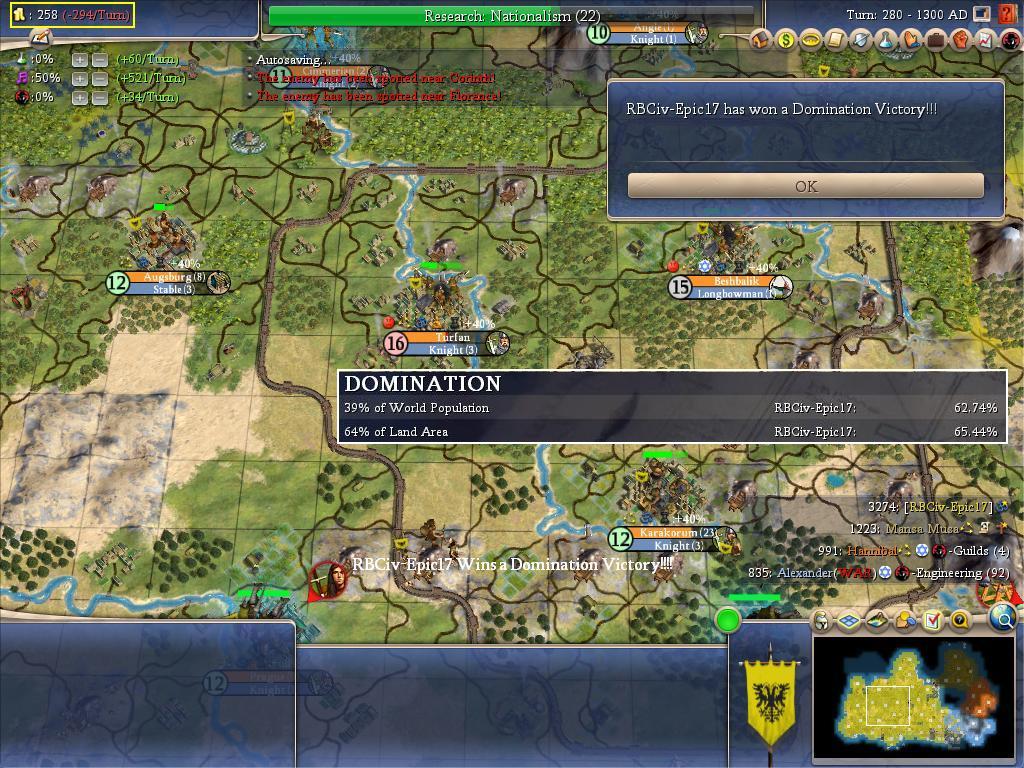 The other thing I want to comment on here is the sad state of my finances. I've been doing so much fighting that war weariness is absolutely killing my civ, forcing me to run the luxury tax at a huge rate. It didn't help that I had opted to train knights and maces instead of building theatres and colosseums in my core cities! Similarly, the fact that I had been whipping theatres initially in my new captures (rather than rathauses) plunged my economy into the toilet. I was surviving on city capture money, and - as you can see in the upper corner above - I was literally running out of money on the turn that I triggered Domination. Oh, I could have gone on a couple more turns at this rate, just not too much longer. I think that I timed the economic side of things very well in this game; too much sooner, and my civ wouldn't have been able to bear the costs of Domination!