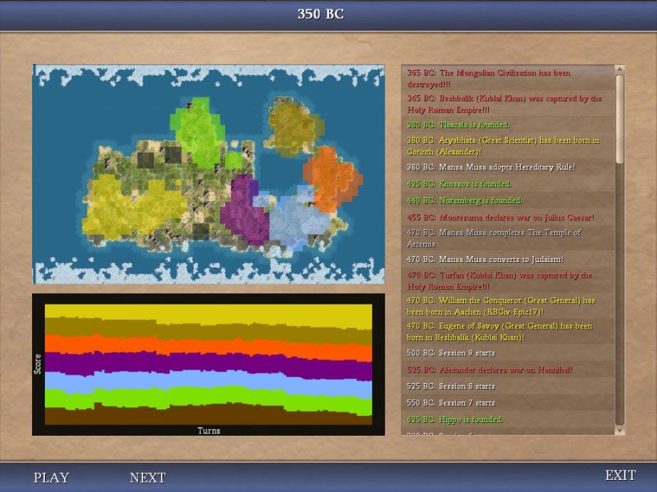 I would call the starting position somewhat crowded, but not unduly so. (Judging by his comments in the forums, LK doesn't agree with me!) There's plenty of room to spread out to the north, and the player has free run on the entire western third of the pangaea if he or she takes out Kublai (that being a big "if", of course!) The only ones really shafted on land in this game are Mansa and Hannibal; I figure their economic advantages will be enough to carry them through.