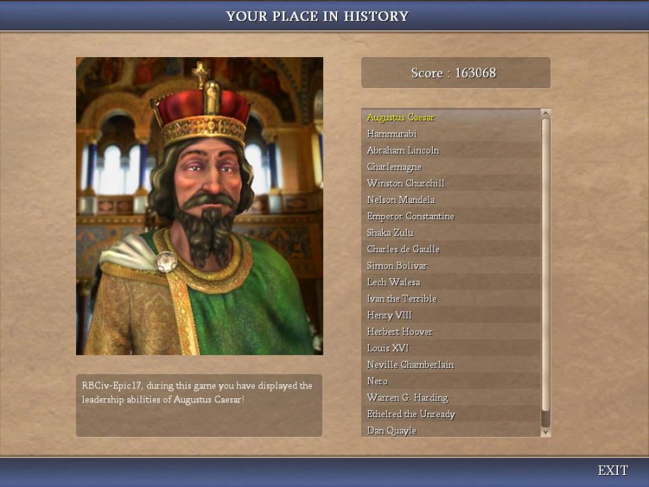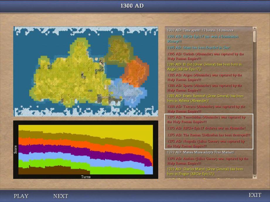 Victory. I essentially consumed Azteca + Rome to get over the land requirement. I also boxed in white the crazy 1275AD turn where I wiped out Caesar, then proceeded to declare on Alex and grab one of his border cities! And even a game that doesn't get past 1300AD still takes me over 12 hours to play. I'll never win a fastest finish game accoring to the in-game clock!
