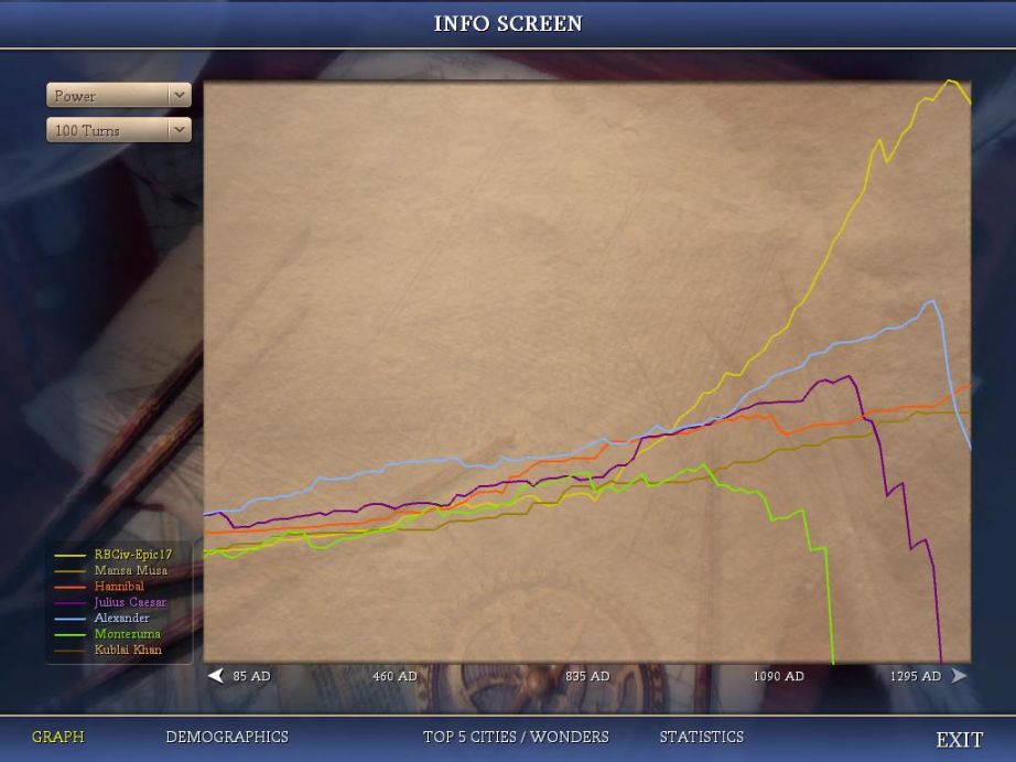 Here's the power graph over the preceding 100 turns. I was in the middle to the low part of the pack throughout the early AD years, and during the period of sneak-attacks from Alex and Caesar. Starting right around 850AD, I begin shifting my civ over to a wartime footing and start steadily climbing the charts. This really takes off around 1100AD, as I trigger my Golden Age and start churning out the military units from basically every city. I think it's interesting to see how even in a dominant military performance like this, I had no discernible advantage over the AI civs until the final 20 or so turns of the game. Everything before that was simply playing the AIs for chumps based on superior tactics.