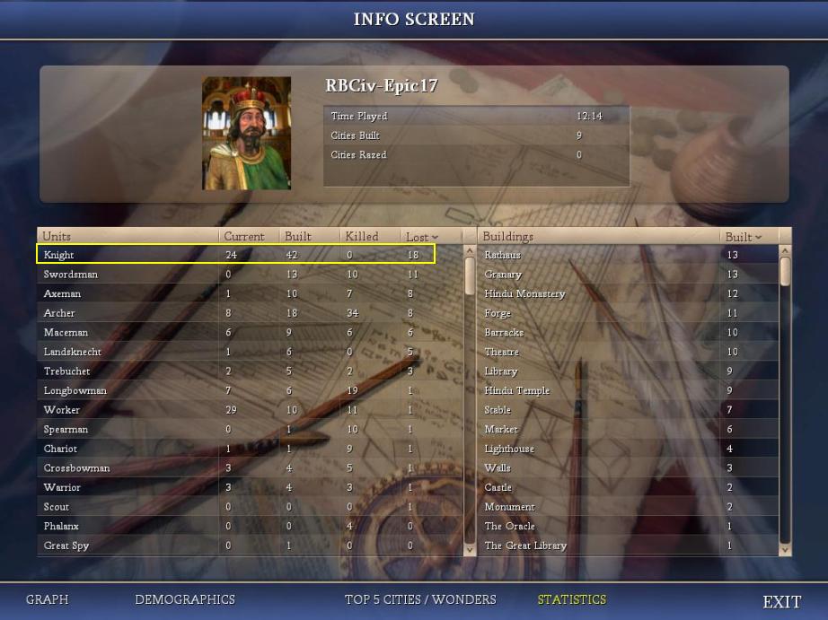 The unit and building stats. The top city improvement is... the Rathaus! I think that justifies my choice of the Holy Roman Empire in this game. Over on the unit side, what I really want to point out are the knight numbers. I didn't discover Guilds until 1060AD, turn 251 of the game. I won by Domination in 1300AD, turn 280. In those intervening 30 turns, I managed to train no less than FORTY-TWO knights!