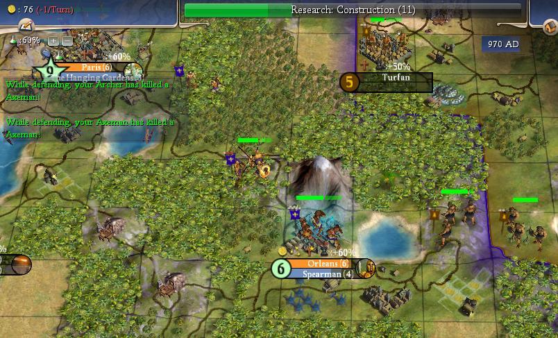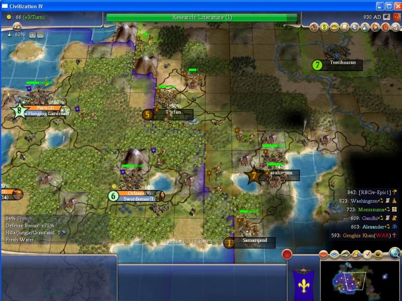 One nice thing about this game is that if an AI civs declares on you in the interturn, they can't move any units into your territory until the following interturn (apparently their turn follows the player's turn). That means I have one grace turn until the Mongols show up, and I used that to move some of the units in Paris forward towards Orleans, which I expected to be the target of the initial Mongol aggression. As far as what my cities are building, I need to wait for Paris to finish building the Hanging Gardens before I can have it swap to military, and Orleans is almost done a sword that was intended to head off to the barb front - but which I'll end up keeping the city to be safe. Fortunately, I already had a fair amount of units on hand to deal with the first wave of invaders - several archers, 2 axes, 2 spears, and a sword. Here on Epic, you CANNOT produce units quickly, so you MUST plan ahead of time for combat. No cheap upgrades either. That makes Epic speed the most strategic one of all, where planning dictates success rather than quick thinking. It's a shame that, due to time constraints, almost no Multiplayer games will ever be played on the slower game speeds - that would be a truer test of skill!