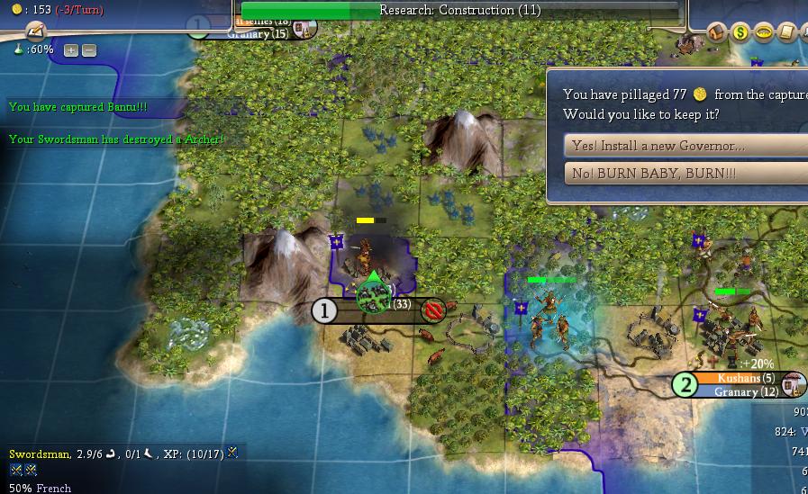 Excellent! No more two-front war to deal with (it's a good thing the Mongols didn't attack earlier, to be honest). Without walls in the city, it was pretty easy for my sword to kill the defenders inside Bantu. And I have a City Raider III sword now too! You can bet that he'll be seeing action against Temujin before too much longer.
