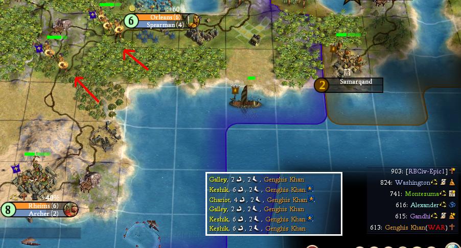 The Civ4 AI frequently manages to impress me, as it did again here. There's no way that the Civ3 AI ever could have done something this clever; having seen all the defenders in Orleans, the AI has loaded up four units on galleys and sent them after Rheims, which only has 1 archer inside it. Nasty stuff. Now the ONLY thing that saved me here was the fact that I could see inside the city of Samarqand, and thus I had a good idea that Temujin was preparing for a naval assault. I've arrowed my spears, which are en route to the south, and hopefully will be able to arrive in time. Rheims should also be able to finish a second archer before the Mongols arrive, but 2 archers still will probably lose to those keshiks. I need to get those spears there!