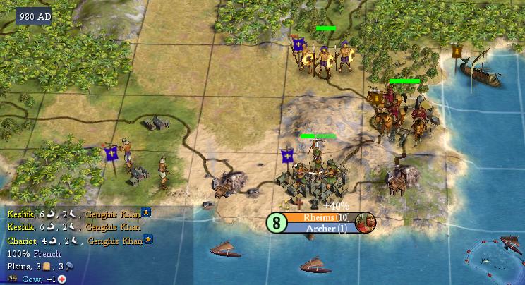 What I did here was kill one of the keshiks with the only spearman that could attack; the other one was too slow to reach the horse stack this turn. Now the one good thing is that due to the way the production cycle works, that archer will be completed in Rheims before the Mongols can attack, but I still need at least one of those archer to survive, which is by no means guaranteed. I gritted my teeth at this point and prepared to retake the city with my spears should it fall.
