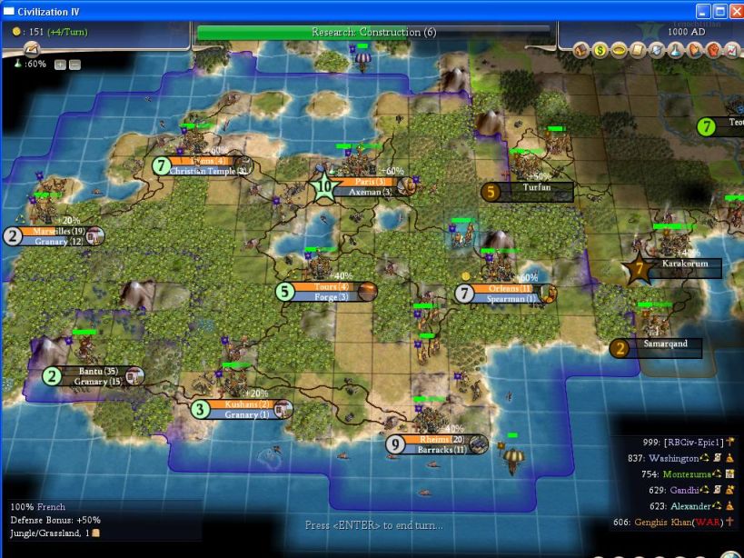 You can't see it here, but I just finished the Hanging Gardens this turn in Paris, giving my cities a nice boost in population (your cities grow SO slowly on Epic speed that it was a big deal indeed). With Paris done with the wonder, I can now shift it onto military units, and Lyons and Tours will also go onto military as well once I have them finish up their current infrastructure projects. Marseilles, Bantu, and Kushans are all long-term projects at the moment, requiring extensive worker development, but they should be strong commercial cities down the road. By this point, I've killed all of Temujin's offensive forces. Now my own war machine is cranking up and I'm about to take the offensive.