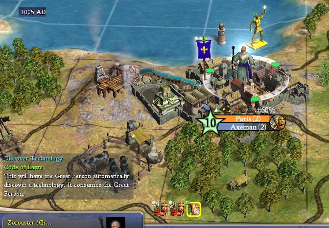 I need courthouses in the worst way, and this Prophet knocked out Code of Laws for free. Deal! Now I could have my outlying cities switch in courthouse builds between some military ones and stop bleeding out so much cash in maintenance costs. Looks like all these wonders plus that "accidental" Parthenon were doing me some good after all.