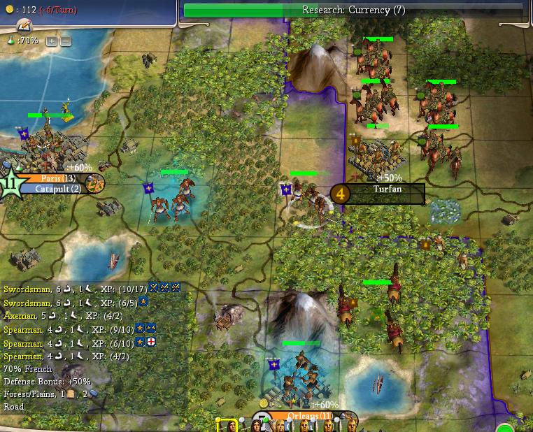 And they all die without doing any damage. Whew. It was very nice that the city the Mongols were attacking happened to be a Holy City with +60% defensive bonus! Orleans is packed with units, as you can see, not much chance of it falling. I have thus survived the first wave, but as you can see, more axes are already on their way.