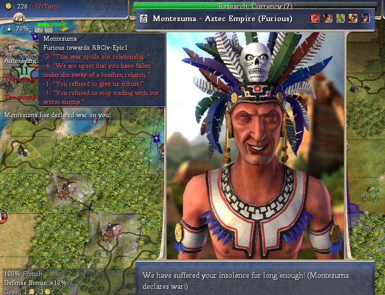 Mongol keshiks and Aztec horse archers continue to duel on the plains of Karakorum; some of the units on both sides were killing each other almost every turn, and Monty had pillaged Temujin pretty hard too. I had no intention of trying to take any Aztec cities at the moment, so even though I remained at war with Monty until he agreed to talk with me, he continued to help me despite our state of war. Very odd stuff here.