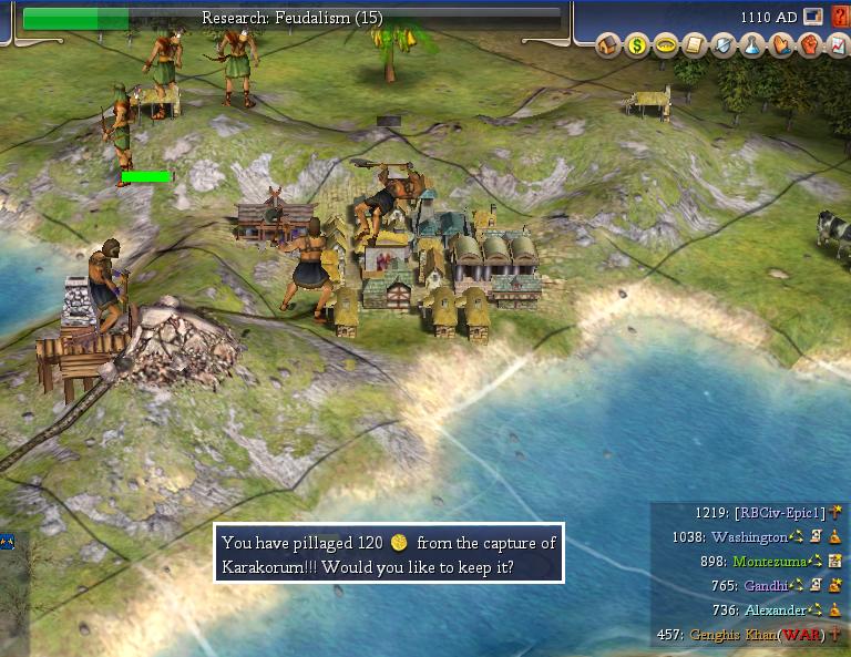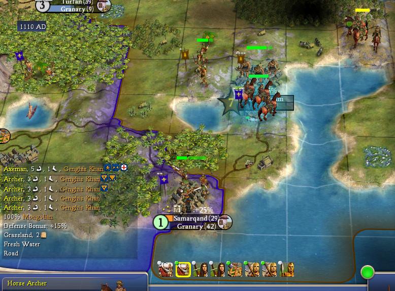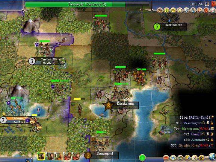 Ordinarily I would probably have razed this city, but by rule I had to keep it, so of course I did. Crammed in between Orleans and Karakorum, it was unlikely Samarqand would amount to much, but at least it could serve as a fishing village. With this city taken, the road was now cleared to make an assault on Karakorum itself.