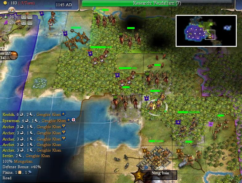 Outside Ning-Hsia, I mount a major attack in 1165AD, but end up one unit short of taking the city. Nuts! I'm left with one archer still alive in the Mongol city but no attacks remaining on my units. That was a mistake on my part, I attacked prematurely and ended up not having enough units to get the job done. I hoped that maybe the city would survive for a turn and I could take it then, but no such luck: