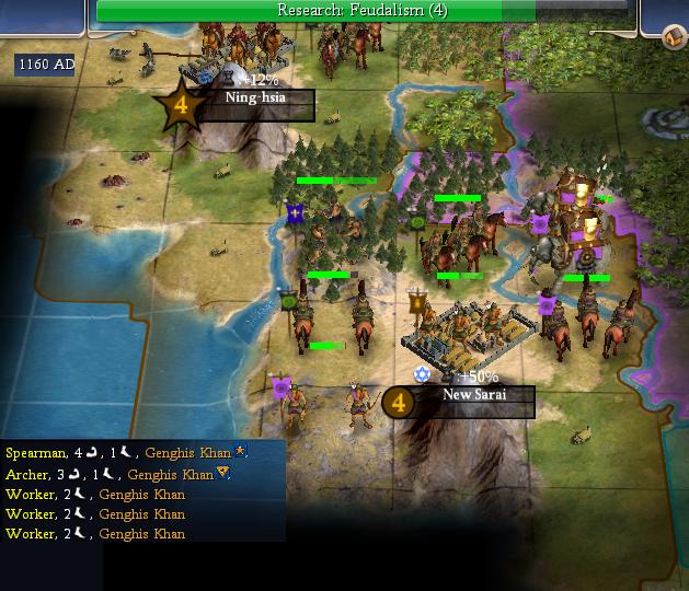 This is the very picture of "biting off more than you can chew"! That city may have a spear and city walls, but there's no way that it's going to be able to hold out against all those horse archers and Gandhi's elephant. I guess nobody likes Temujin - what a shame.
