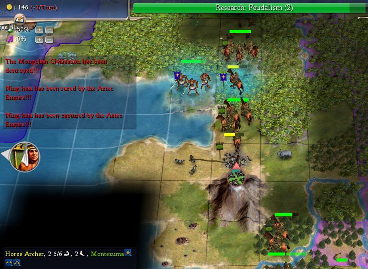 That's... uh, that's not what I was looking for. Now all those Aztec horse archers you saw in the last picture weren't helping me, they were battering away at the newly captured city of Turfan to take it away from ME! Fortunately, I already had a lot of spears on hand to defend the Mongol keshiks, and they provded to work just as well against those Aztec horse archers. A bunch of them suicided against a Combat II/Formation spear that I had, and that pretty much ended any immediate threat to Turfan. I stationed an axe and two spears along with an archer there and began moving my main stack to the east to head for the Mongol capital.